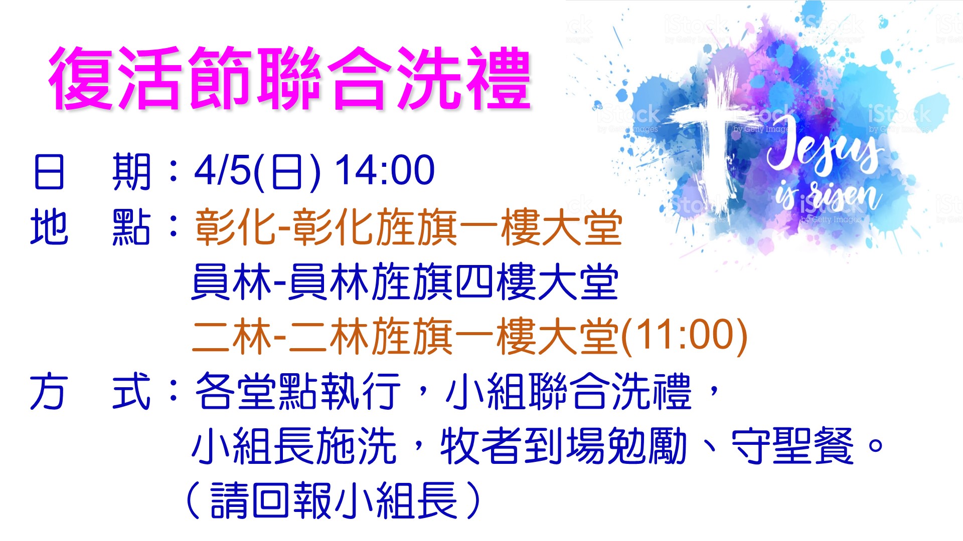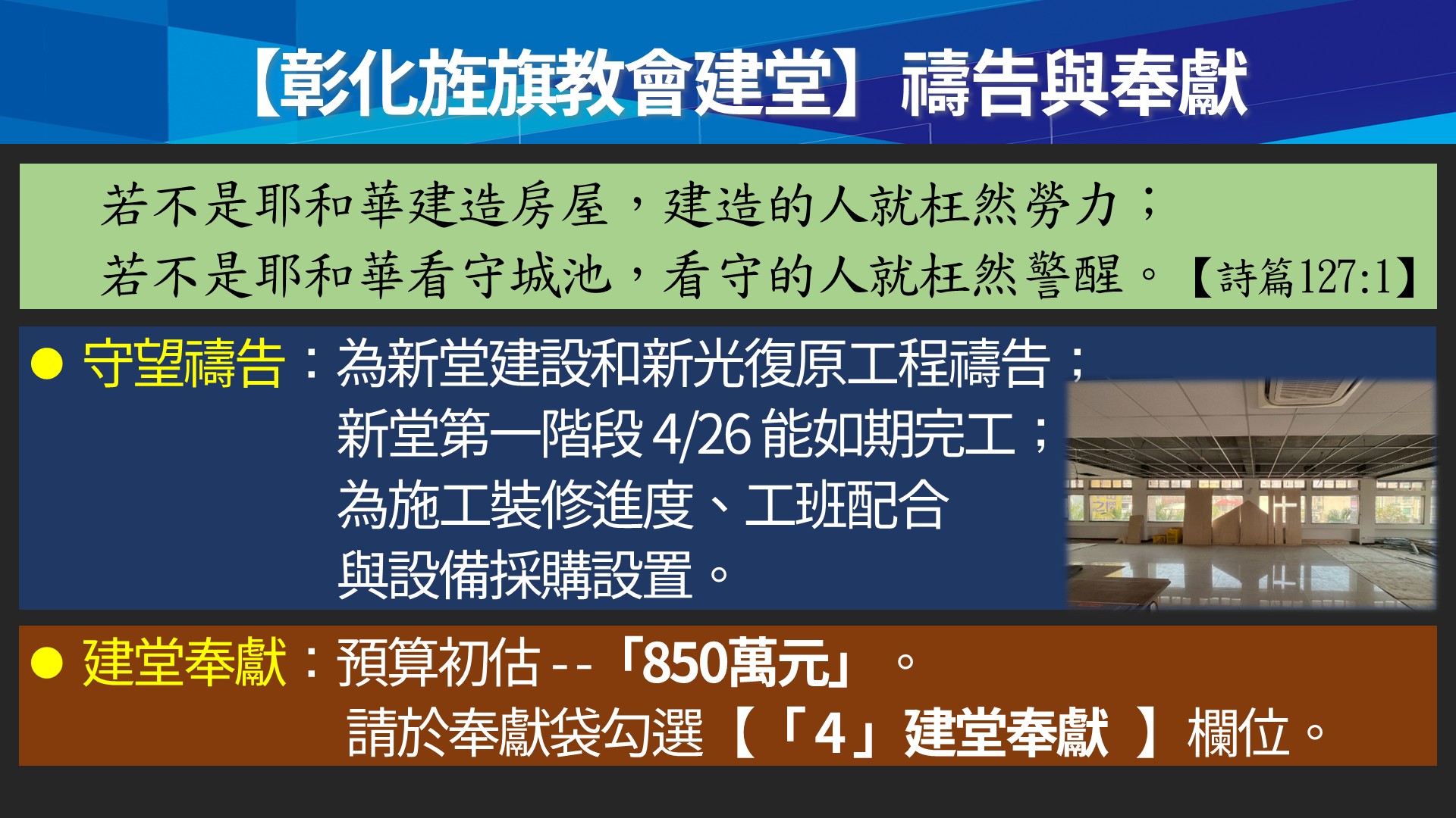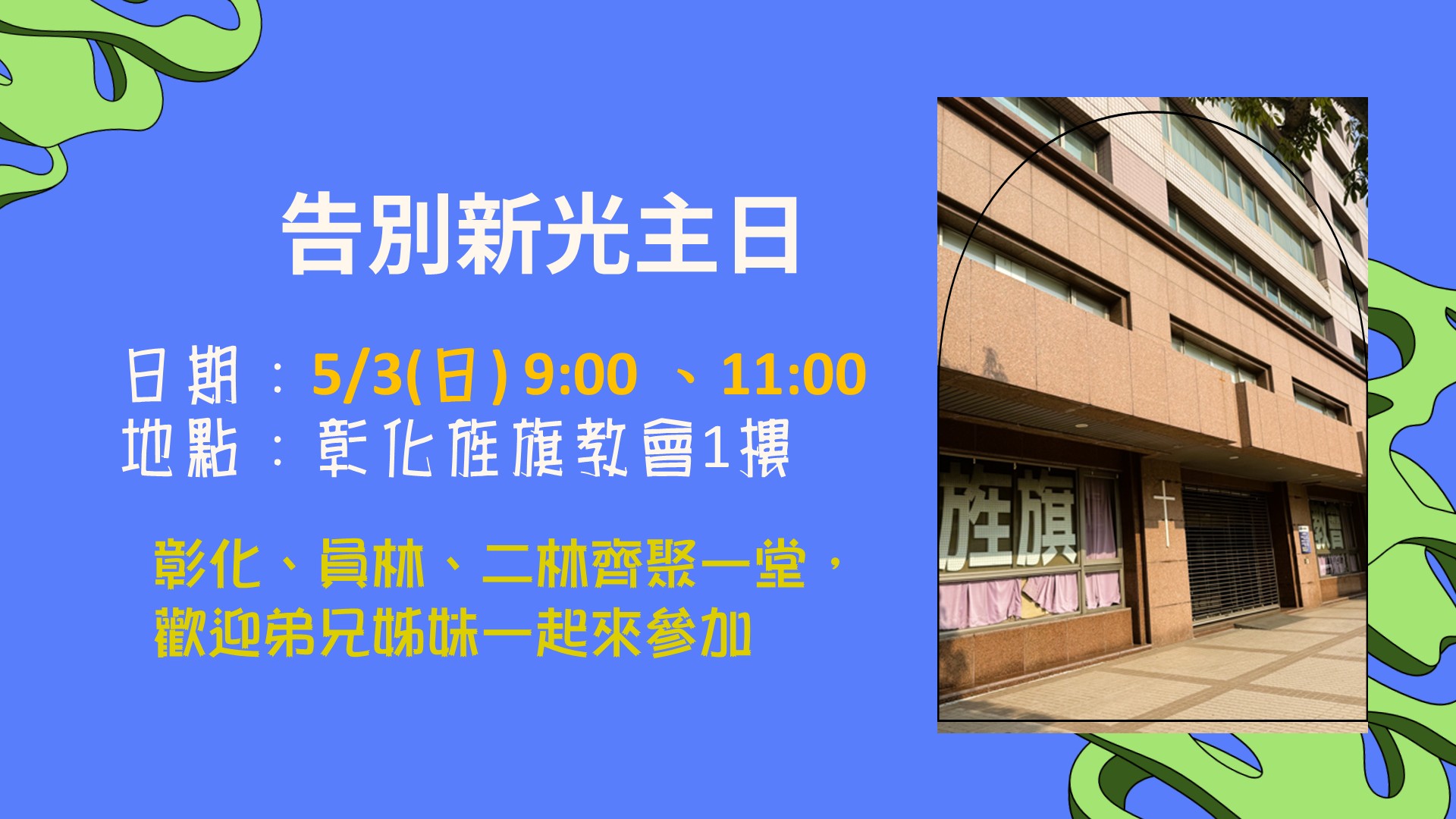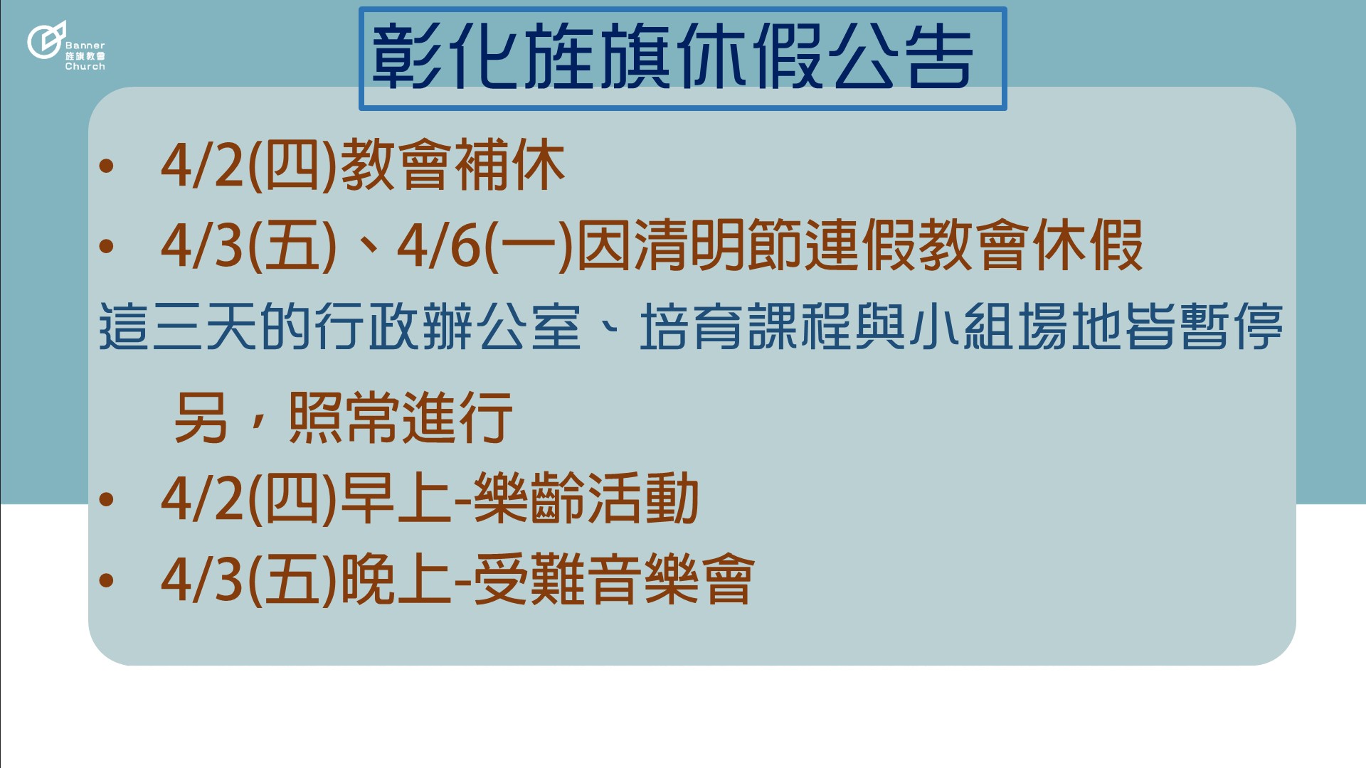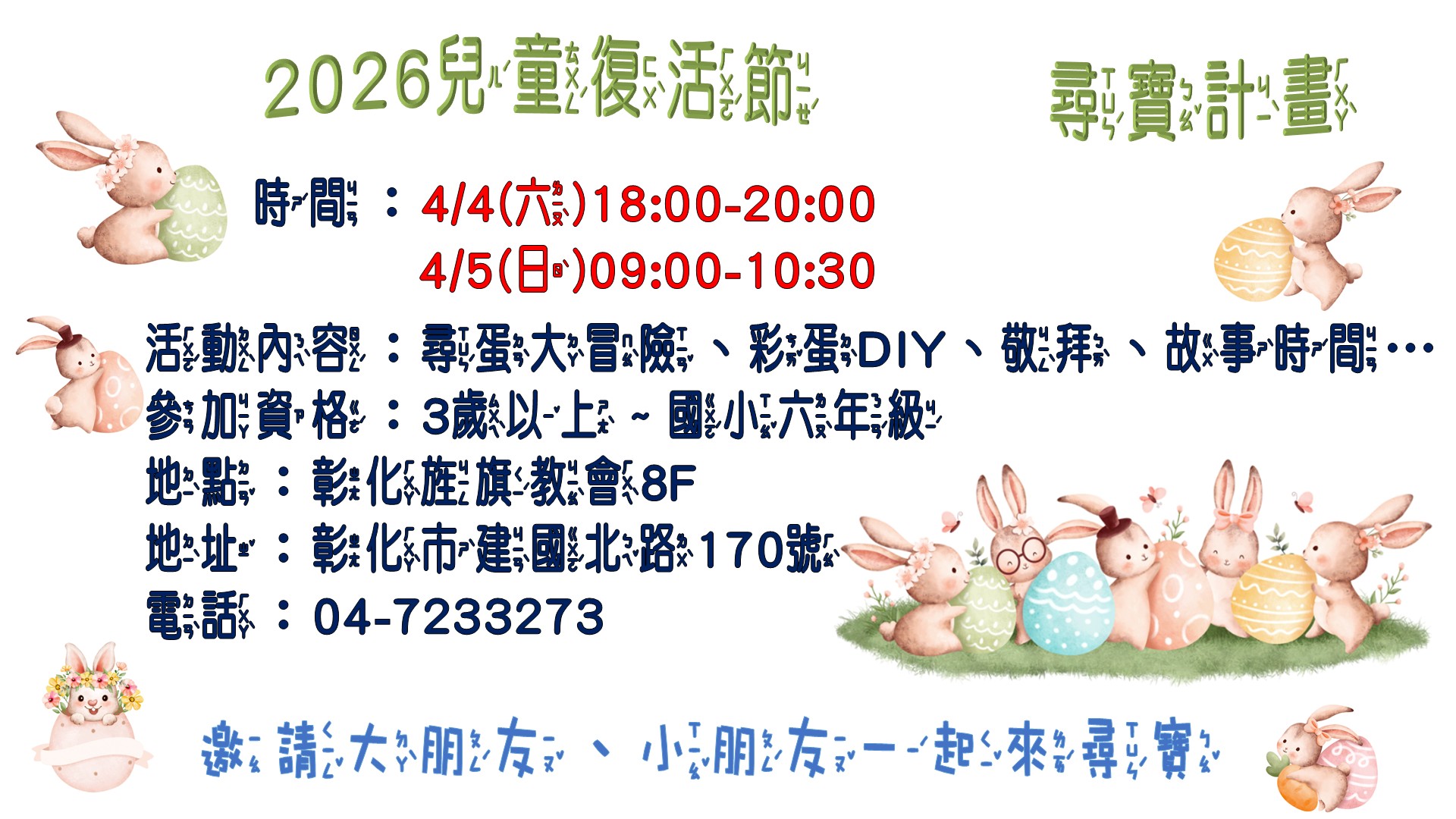 關於我們 聚會點資訊 線上直播 跟著旌旗教會一起線上主日 培育課程 培育營會與課程介紹 加入彰化旌旗 歡迎您加入彰化旌旗大家庭! 最新資訊 成人主日信息 2026年4月份成人主日講座 遇見復活的主 Encountering the R 教會公告 休假公告與活動提醒 ●4/2(四)教會補休 4/3(五 活動快訊 2026兒童復活節 尋寶計畫日期:4/4(六)18:00   活動快訊 復活節聯合洗禮 日期:4/5(日)14:00地點: 奉獻 『萬軍之耶和華說:你們要將當納的十分之一全然送入倉庫,使我家有糧,以此試試我,是否為你們敞開天上的窗戶,傾福與你們,甚至無處可容。』瑪拉基書3:10 感謝所有弟兄姊妹的代禱與奉獻,願神親自紀念您的擺上! 線上奉獻