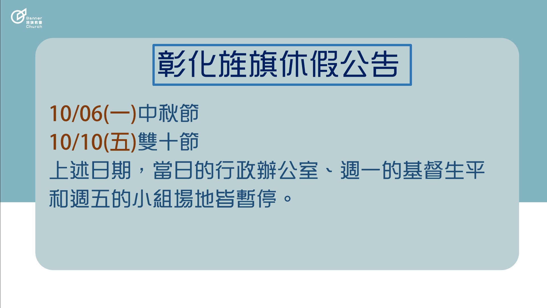 關於我們 聚會點資訊 線上直播 跟著旌旗教會一起線上主日 培育課程 培育營會與課程介紹 加入彰化旌旗 歡迎您加入彰化旌旗大家庭! 最新資訊 成人主日信息 2025年10月份成人主日講座 成為耶穌的門徒Becoming Disciples of J 教會公告 2025中秋與雙十節休假公告 10/6(一)中秋節、10/10(五)雙十節,以上日期的行政 教會公告 休假公告0929 因應9/28(日)教師節,9/29(一)教會補休一日,當日行 教會公告 場地異動與員林青年歡慶公告 ★0927(六)場地異動 因彰化成 奉獻 『萬軍之耶和華說:你們要將當納的十分之一全然送入倉庫,使我家有糧,以此試試我,是否為你們敞開天上的窗戶,傾福與你們,甚至無處可容。』瑪拉基書3:10 感謝所有弟兄姊妹的代禱與奉獻,願神親自紀念您的擺上! 線上奉獻